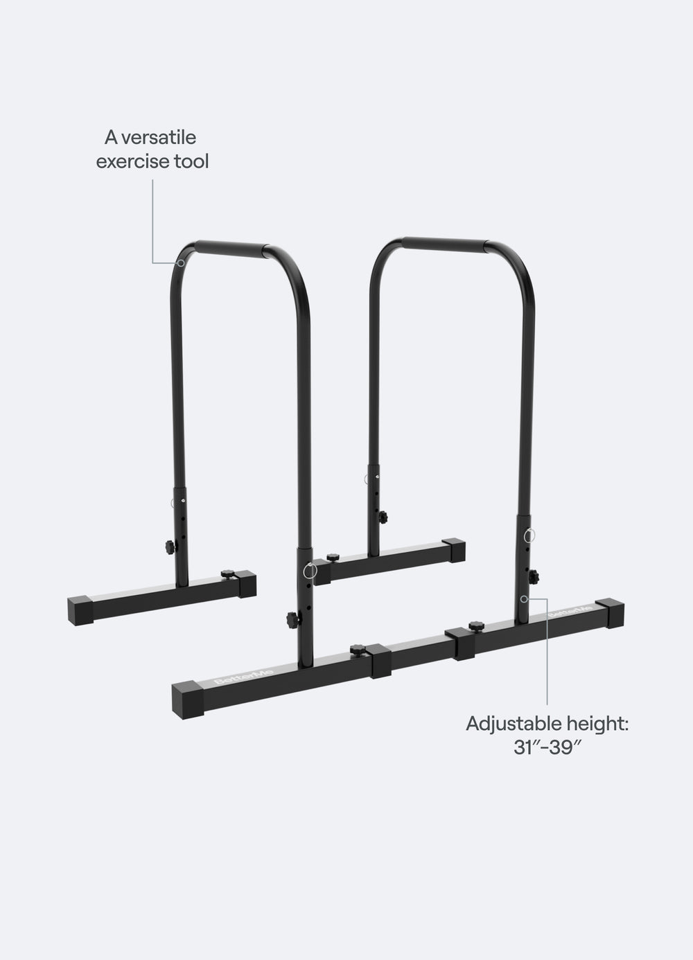 Take your calisthenics, gymnastics, and functional workouts up a notch with these adjustable-height parallettes. Engineered for total stability movement, they adapt seamlessly to your training goals. Whether you're indoors or outside, you'll feel the difference—in your form, control, and comfort. But be sure you train on a firm, level surface. Do not use on soft or uneven ground (e.g. grass, sand, carpet), as this may cause tipping or injury.