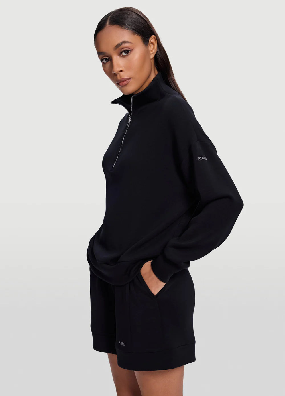 - Sweatshirt: Relaxed fit, half-zip front