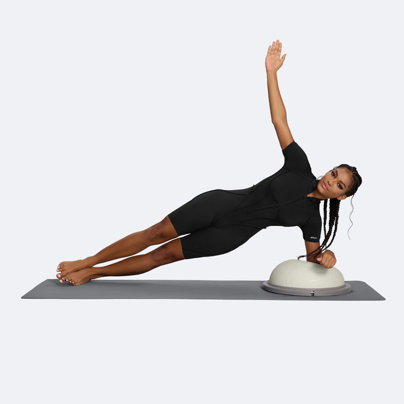 Perform a side plank with your elbow resting on the Balance Ball Trainer for an extra stability challenge. Ensure your elbow is directly under your shoulder. This exercise builds core stability, oblique strength, and balance control.