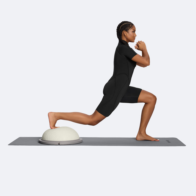 Place your back foot on the Balance Ball Trainer. Perform a pulsing motion in a reverse lunge position, lowering and lifting with control. This exercise builds leg strength, balance, and lower body coordination.
