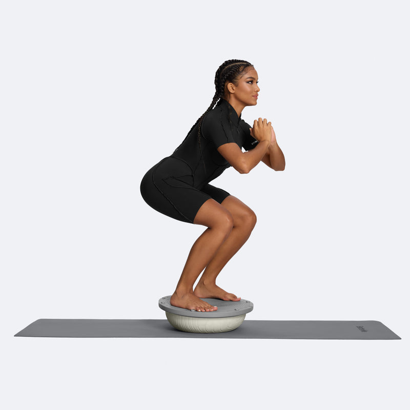 Stand on the flat surface of the Balance Ball Trainer and perform squats, maintaining control and balance. This exercise builds lower body strength, ankle stability, and overall balance.