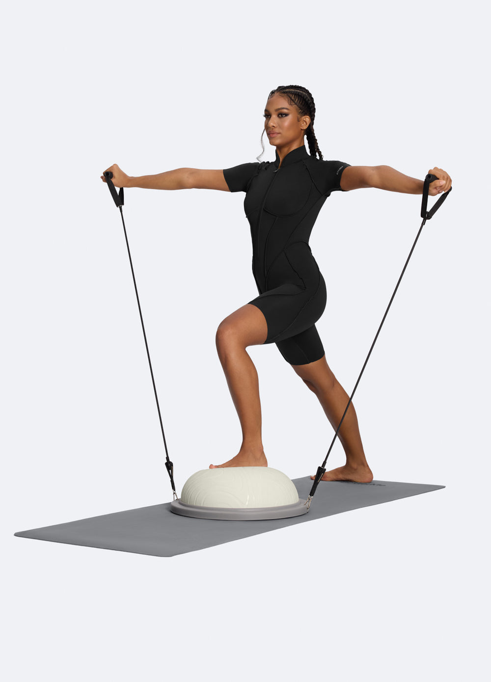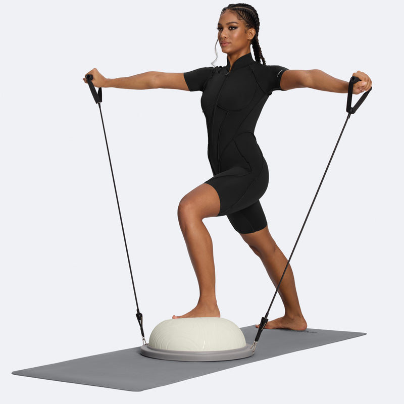 Attach the two elastic handles from the set to the Balance Ball Trainer. Place one foot on the trainer for support. Hold the handles in your hands and slowly open and close your arms to the sides, controlling the resistance. This exercise builds chest strength, shoulder stability, balance, and core engagement.