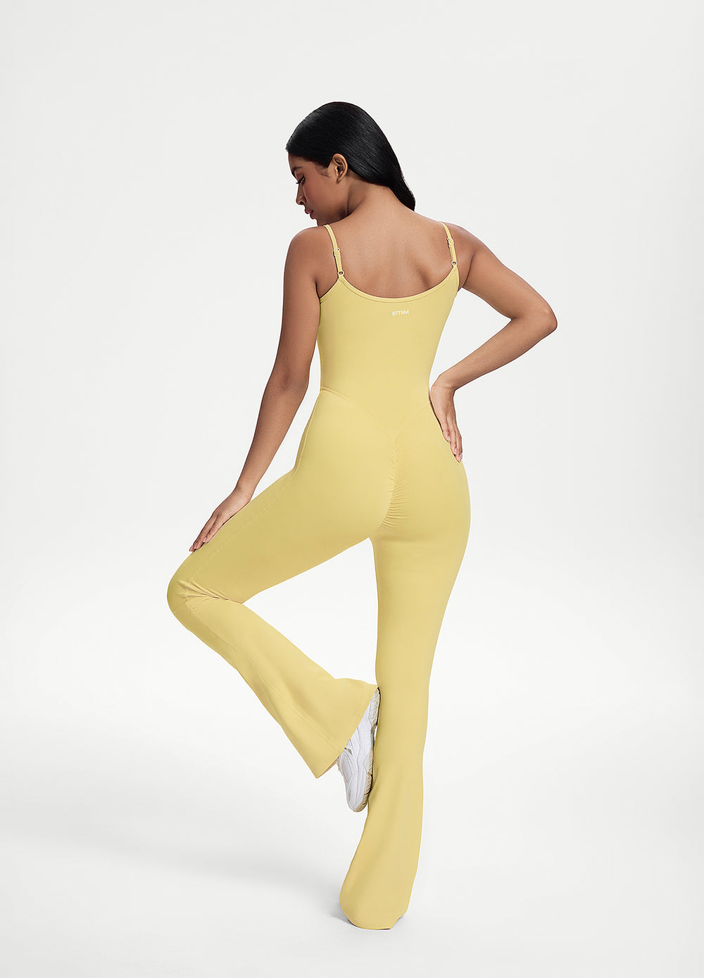 With a sculpted fit, flared leg, and subtle scrunch detail at the back, this trending onesie hits all the right angles — no styling stress required.
