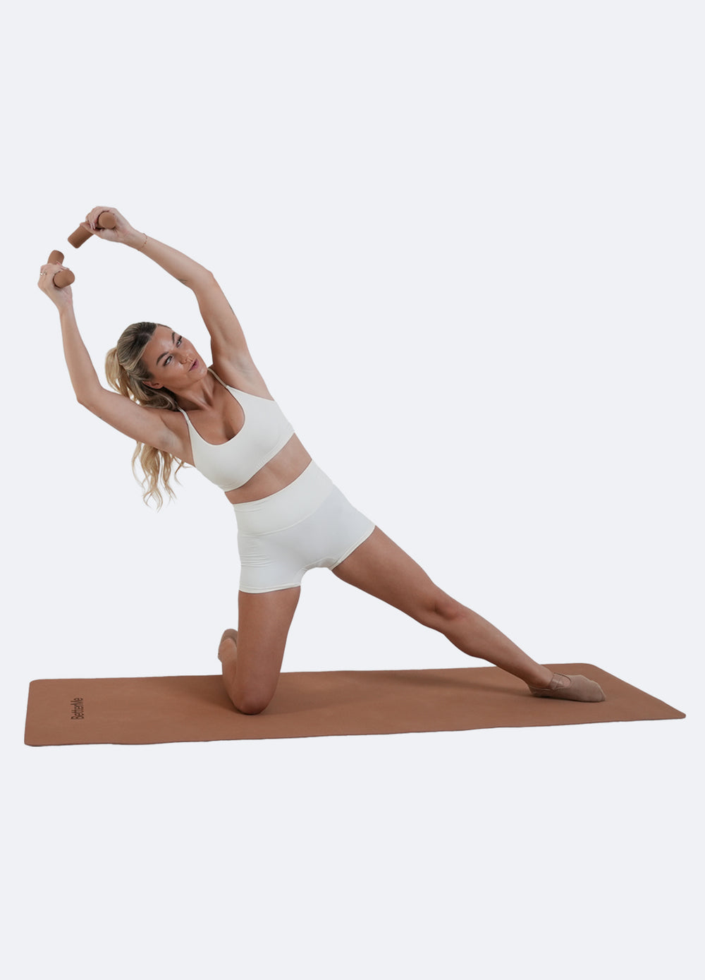 Comienza en una plancha lateral con la mano derecha en el suelo. Sujeta la mancuerna con la mano izquierda por encima de la cabeza. Dobla las rodillas y baja el brazo hacia los pies. Estira las piernas y vuelve a subir el brazo. A continuación, dobla el brazo izquierdo hacia el suelo delante de ti. Vuelve a la posición inicial con el brazo por encima de la cabeza.