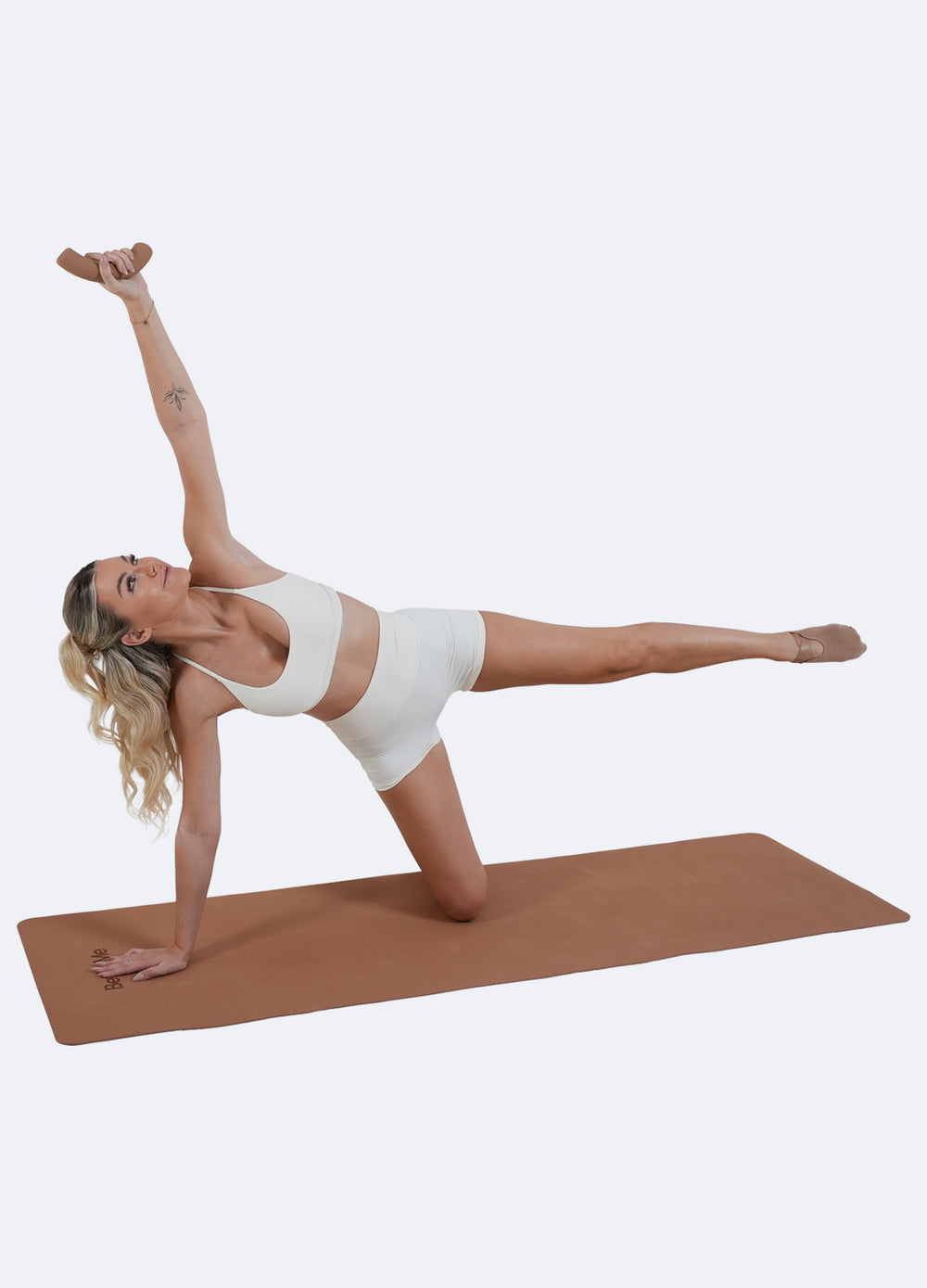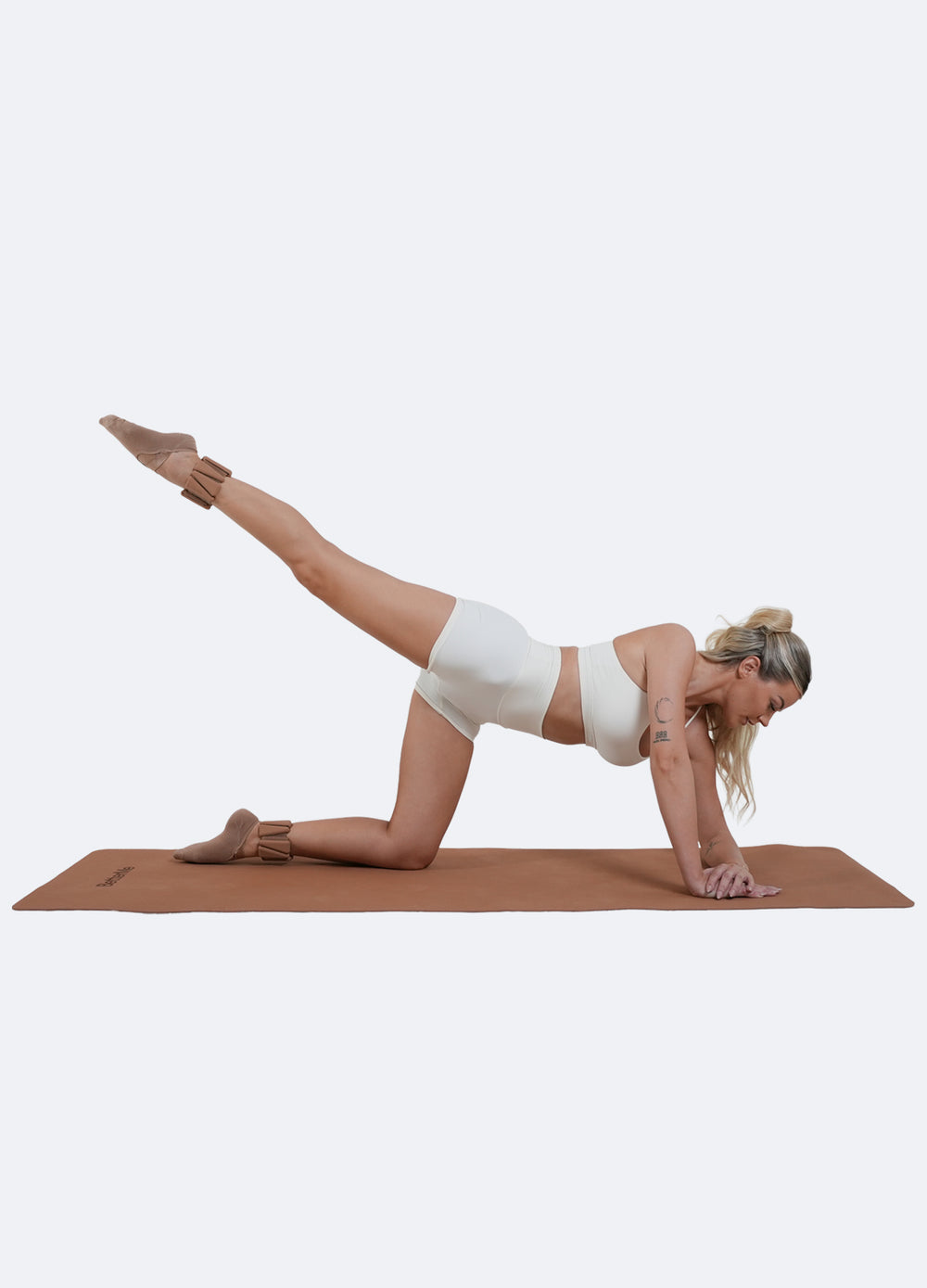 Comienza de rodillas con pesas en los tobillos, luego coloca la mano derecha en el suelo mientras extiendes la pierna izquierda hacia un lado. Levanta el brazo izquierdo mientras sostienes la mancuerna. Levanta la pierna izquierda y baja el brazo izquierdo en un arco para alcanzar la pierna levantada. Vuelve a la posición inicial.
