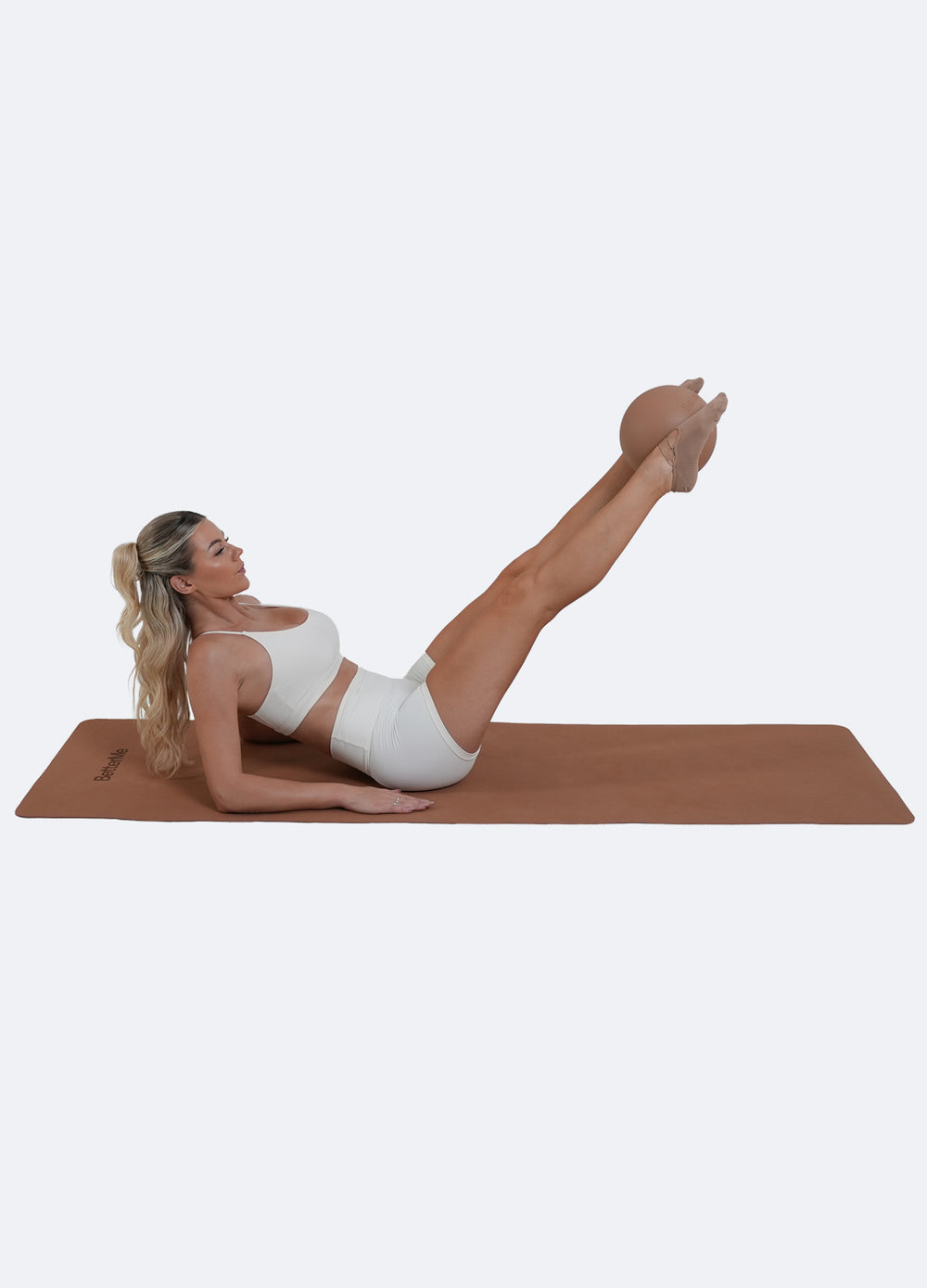 Siéntate con pesas en los tobillos y coloca la pelota blanda entre ellos. Inclínate ligeramente hacia atrás y baja hasta apoyar los antebrazos. Extiende las piernas hacia delante en ángulo ascendente. Dobla ambas rodillas hasta que los dedos de los pies toquen el suelo. Vuelve a estirar las piernas mientras mantienes la pelota en su sitio.