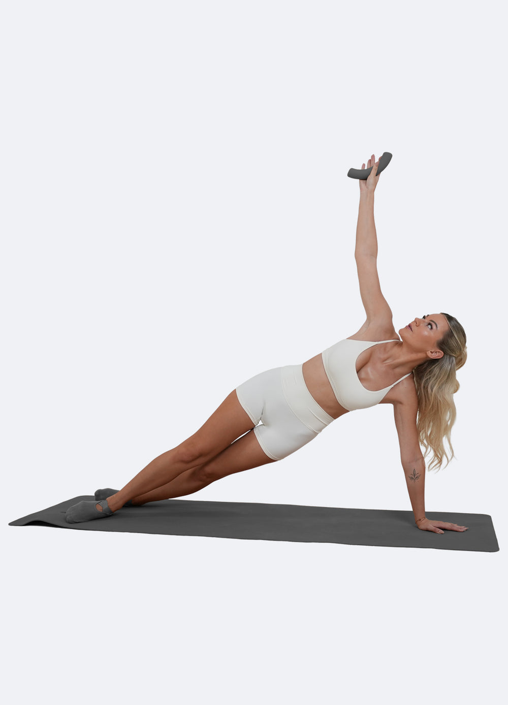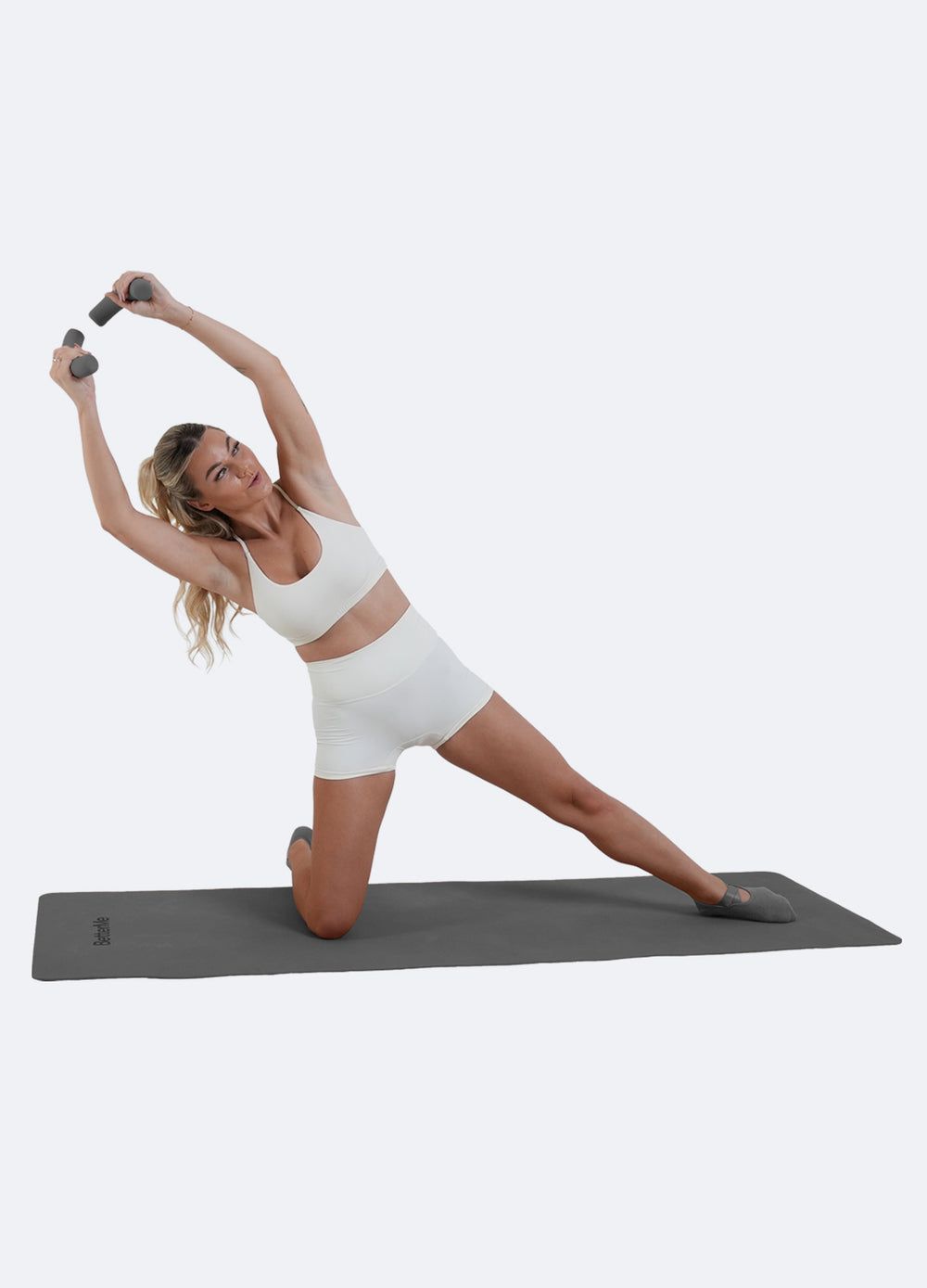 Comienza en una plancha lateral con la mano derecha en el suelo. Sujeta la mancuerna con la mano izquierda por encima de la cabeza. Dobla las rodillas y baja el brazo hacia los pies. Estira las piernas y vuelve a subir el brazo. A continuación, dobla el brazo izquierdo hacia el suelo delante de ti. Vuelve a la posición inicial con el brazo por encima de la cabeza.