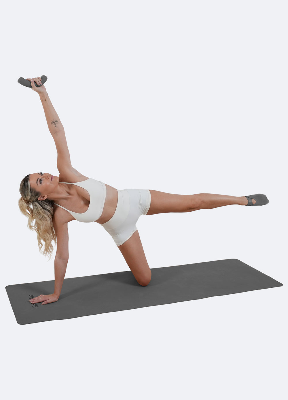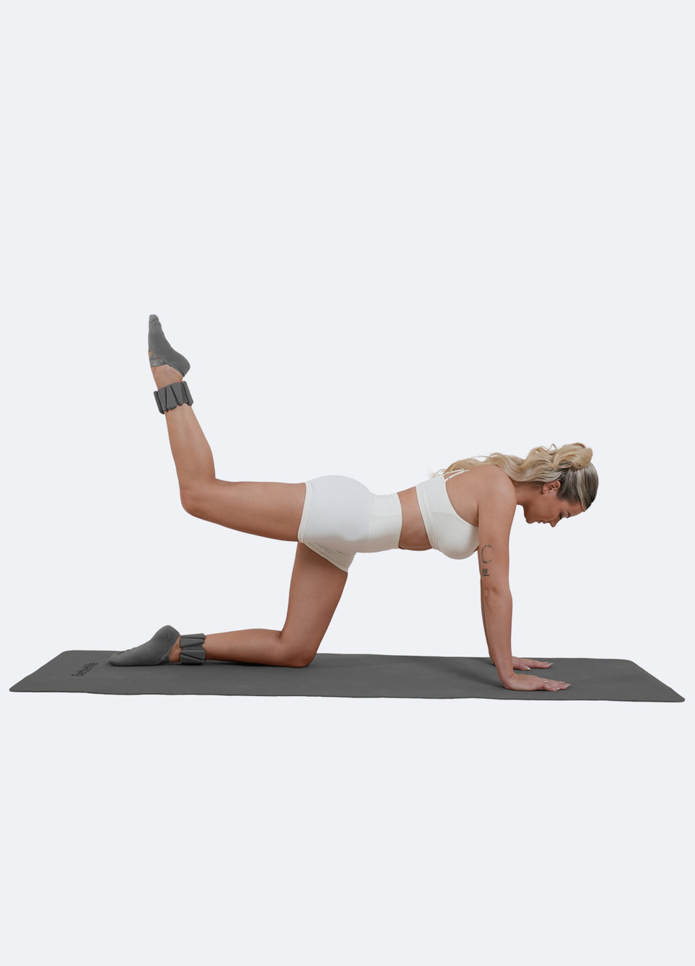 Comienza de rodillas con pesas en los tobillos, luego coloca la mano derecha en el suelo mientras extiendes la pierna izquierda hacia un lado. Levanta el brazo izquierdo mientras sostienes la mancuerna. Levanta la pierna izquierda y baja el brazo izquierdo en un arco para alcanzar la pierna levantada. Vuelve a la posición inicial.