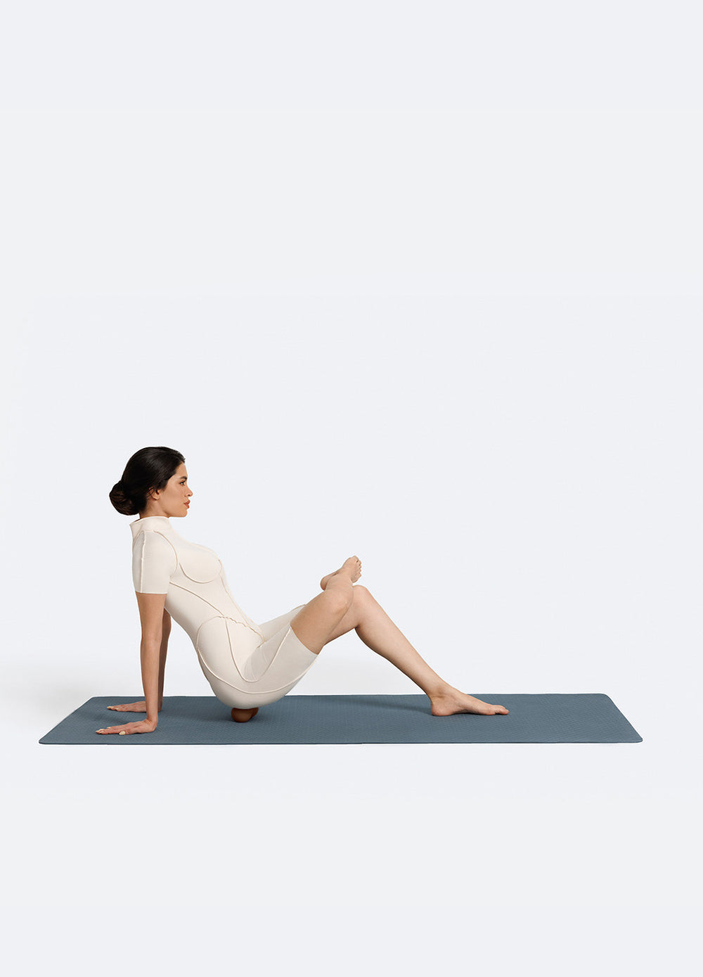 Siéntate con las piernas estiradas y coloca la pelota tipo cacahuete debajo de la pantorrilla. Dobla la otra rodilla. Gira lentamente la pierna sobre la pelota, desde el tobillo hasta la rodilla. Haz una pausa y mantén la posición en los puntos tensos. Apóyate con las manos en el suelo detrás de ti. Puedes girar suavemente el pie para liberar más tensión.