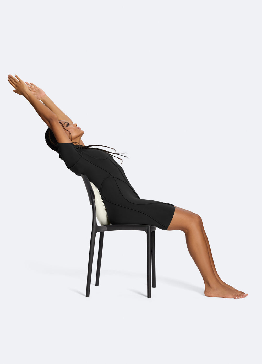 Presiona el cojín contra el respaldo de la silla y reclínate suavemente para crear una leve extensión en la columna y abrir el pecho. Usa las manos para apoyo si es necesario. Este ejercicio estira la espalda, alivia la tensión y favorece una mejor postura.