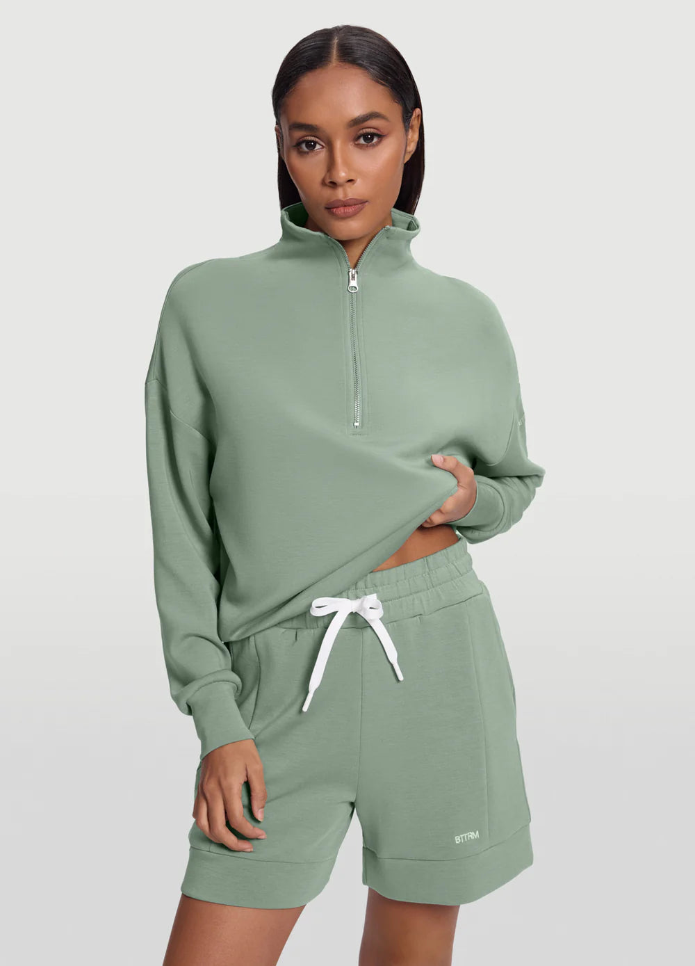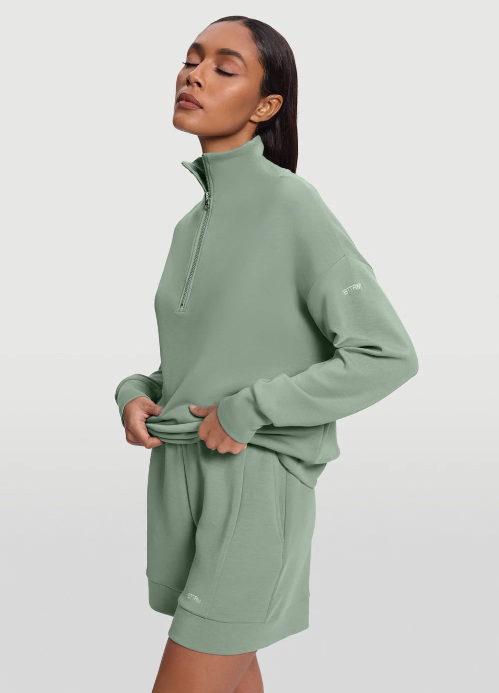 - Sweatshirt: Relaxed fit, half-zip front