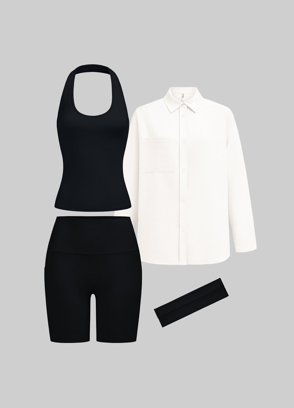This light and breezy set combines sporty layers and casual comfort. From the halter tank to the sheer button-up shirt, every piece is easy to wear, all day long.