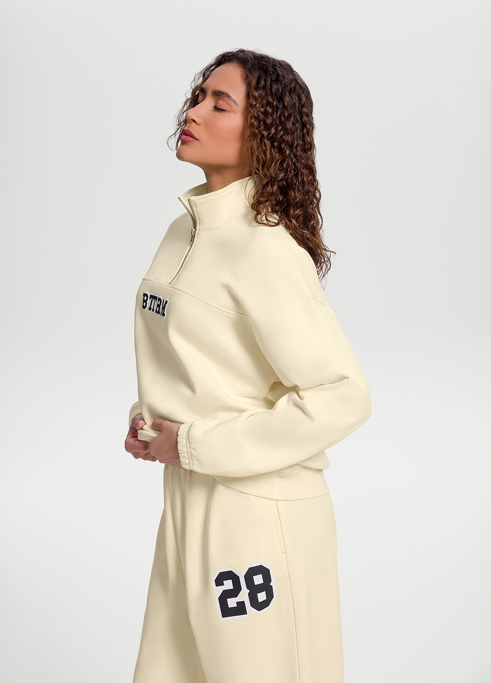 This oversized sweatshirt blends everyday comfort with varsity flair. Made from 100% soft cotton with a zip front and bold graphics to stand out.
