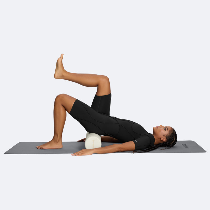 Place the roller perpendicularly under your glutes. Lie on your back. Bend your knees at 90°, lift one leg off the floor. Alternate lifting each leg toward the chest, performing a controlled “march” while balancing on the roller. This exercise strengthens core, glutes, and improves balance.