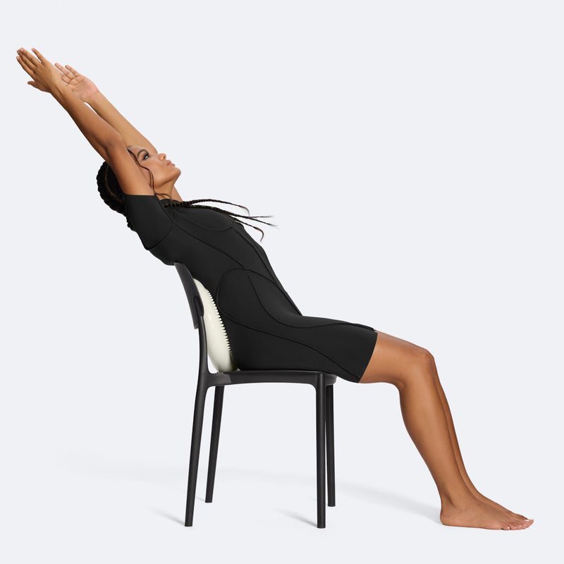 Place the cushion against the back of a chair and lean back over it, allowing your spine to gently arch and shoulders to open. Support yourself with hands if needed. This exercise stretches the back, relieves tension, and encourages upright posture.
