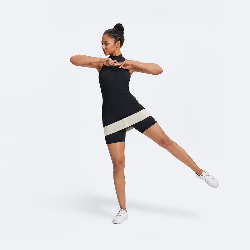 Secure the band above your knees. Enter a squat with outstretched arms. Stand on your left leg, sweep your right leg to the side, then back. Repeat and enjoy the intensity!