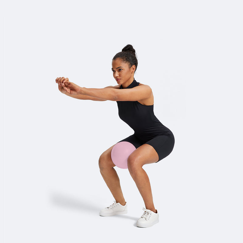 Stand tall and squeeze the ball between your knees. Squat to a 90-degree angle. Make sure not to drive the knees over your toes. As you squat, raise your extended arms. Repeat the movement.