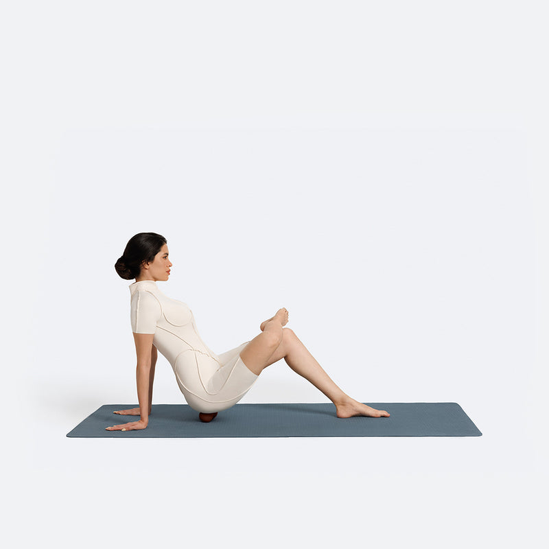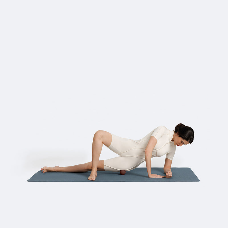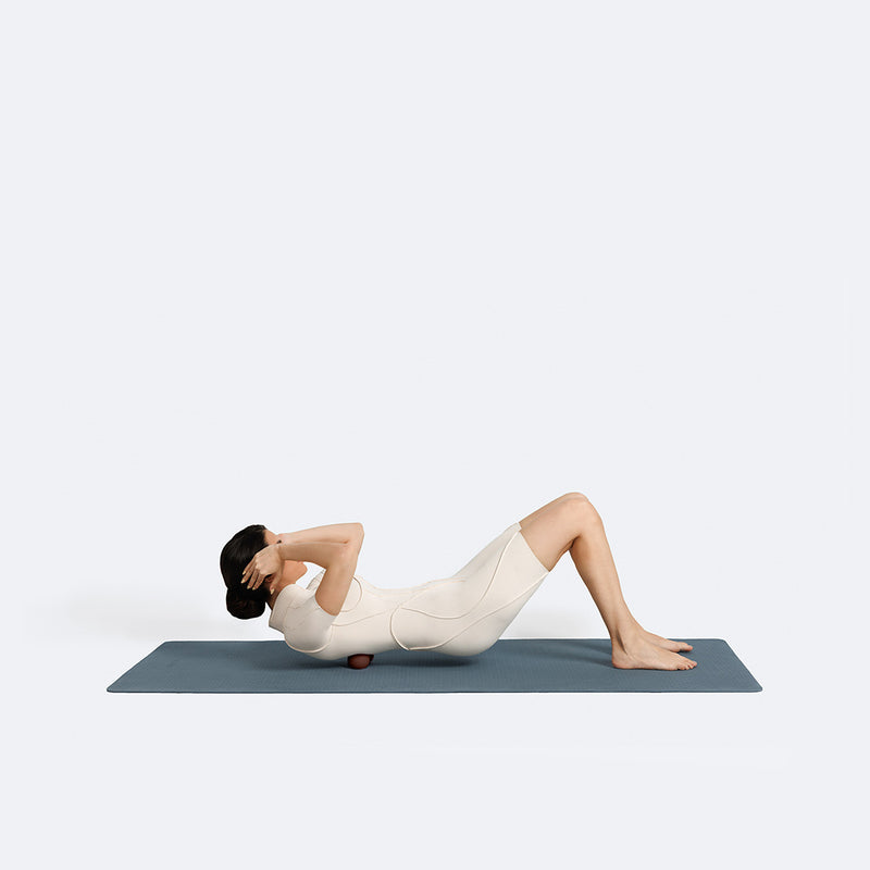 Assume a crunch position and place the Peanut Ball under your back. Place your hands behind your head and engage your core. Gently press your back into the ball and hold for a few breaths. Shift slightly side to side to massage tight areas.