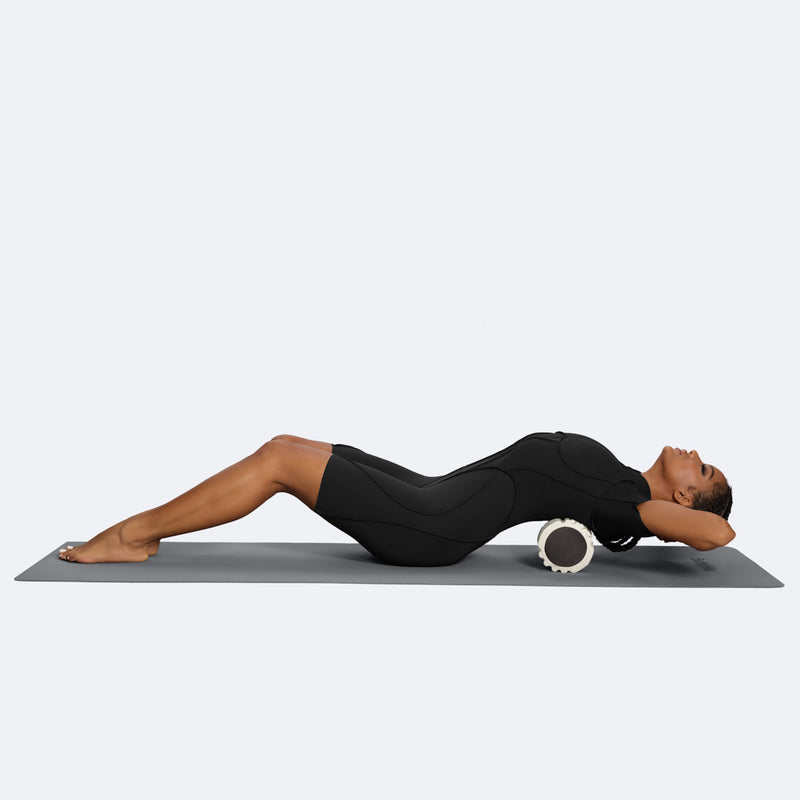 Lie on your back with the roller placed perpendicularly under the shoulder blades. Hands are clasped behind the head for support. Knees are slightly bent for stability. Slowly roll up and down across the upper back, keeping the movement controlled. The core should stay engaged. This exercise can improve upper back mobility and relieve shoulder tension.