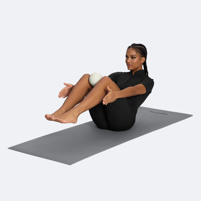 Sit on the floor with your knees bent and feet slightly lifted off the ground. Place the weighted ball between your knees and keep your spine tall. Gently squeeze the ball between your knees while engaging your core to maintain balance. Hold the position for several seconds, breathing steadily. This exercise activates deep core and inner thigh muscles, improving stability and control.