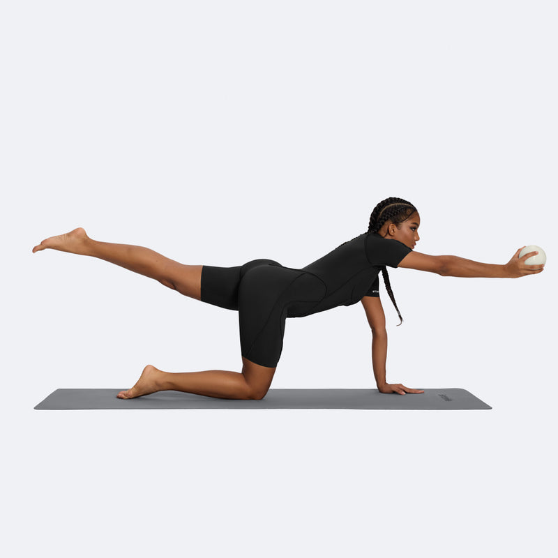 Begin in a bird dog position on all fours. Extend one arm forward, holding a weighted ball, while stretching the opposite leg straight back. Keep your spine neutral and your core engaged, then switch sides. This exercise improves core stability, balance, and shoulder control.