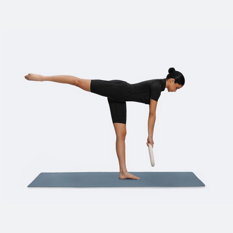 Fique em pé sobre a perna esquerda e segure o Loop de Peso na altura dos quadris. Tente encontrar uma posição equilibrada. Abaixe o corpo e simultaneamente estique a perna direita para trás. Ao abaixar o corpo, leve o Loop até o chão. Repita.