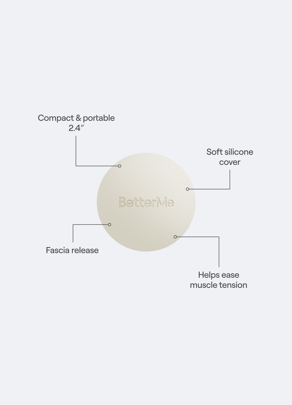 Використовуйте масажний м'яч BetterMe для опрацювання та розслаблення болючих м’язів. Він чудово справляється з важкодоступними ділянками, чинить на них м’який тиск, знімаючи напругу та підвищуючи гнучкість. Завдяки компактному розміру це ідеальний тренажер для дому та подорожей.