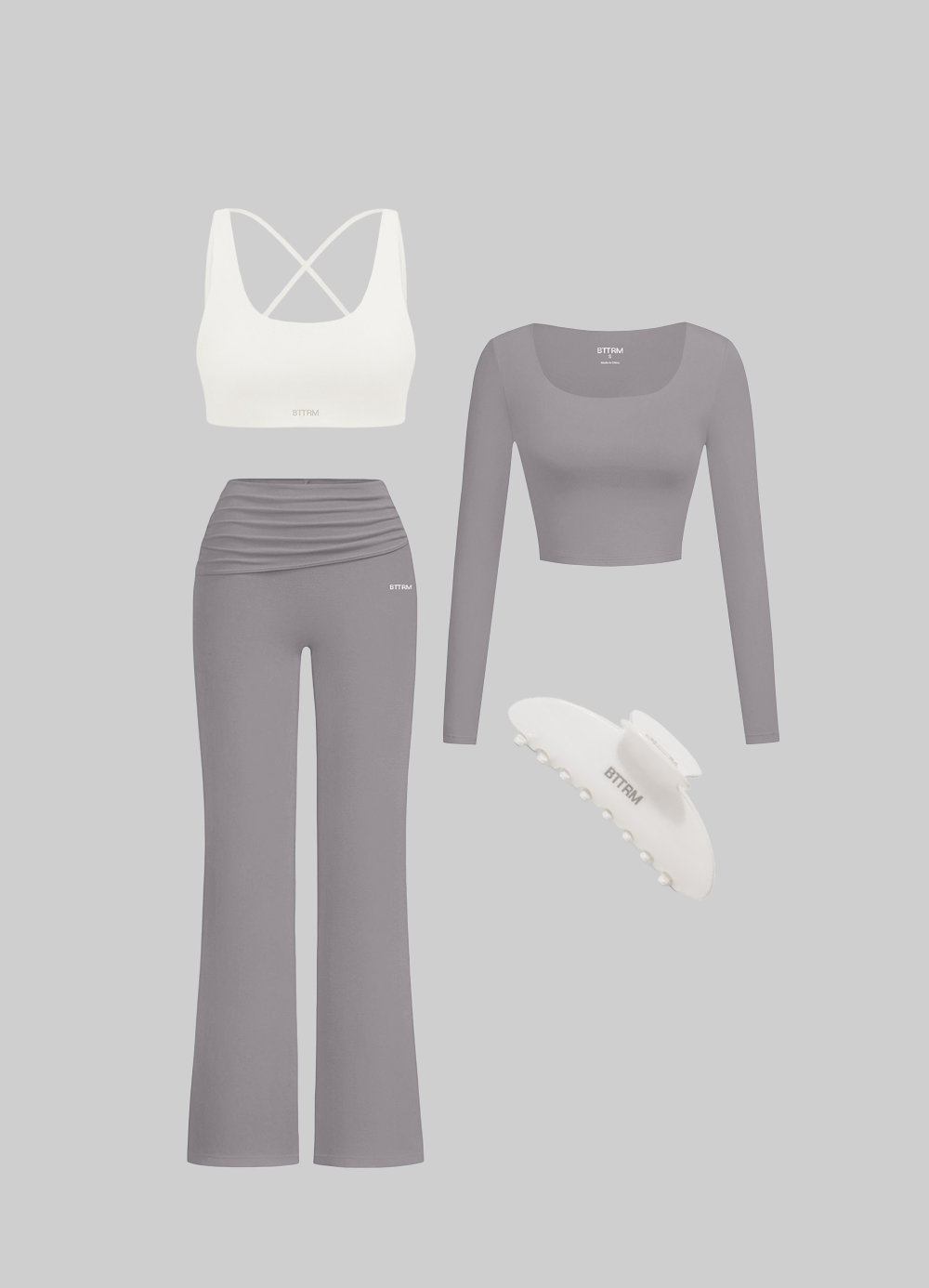 Elevated basics made to lounge, layer, and live in. This 4-piece set pairs soft, stylish staples with a sleek claw clip and a criss-cross back design — because the details matter.